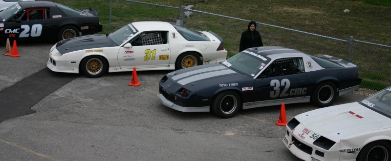 Sunday Nick removes his rookie Rrrrrr's. Rookie no mo'! A new gas cap arrives for him via Hunter's delivery service. I take it easy during qual as these tires have even less tread left than the R888's. In the race I fall back after the start. It takes a few laps to catch back up to Gary Hood. He's down on 7 cylinders. I get past and see Nick way ahead. I doubt I'll have enough laps to catch him, but I'm sure as hell gonna try. Coming onto the front stretch, he's going into one along with a group of 2 lapped cars and a slowed CMC2 car. Hmmm. I should gain time here in traffic. As we are going around carousel, one of the lapped cars motor lets go in dramatic fashion immediately infront of Nick. I'm on the same line as them and EASE to the inside line hoping not to be slipping and sliding on oil. Back hard on the gas and start to close on Nick. A few laps later, once again, I see Greg Hughs up ahead. As we approach gut check, there's a caution flag out for David Love who’s coming right at us! He had went off and was coming back on track up the pit entrance. I get a view of all three white Third Gens in one shot. It's like playing Where's Waldo. Nick gets around Greg as do I as we pass under the white flag. I do a quick check, with David Love behind us, Wirtz should be leading with Dave Francis in second, that means we're fighting for 3rd. It’s ON. I can get right on Nick's bumper once again but can't get by on that last lap.
