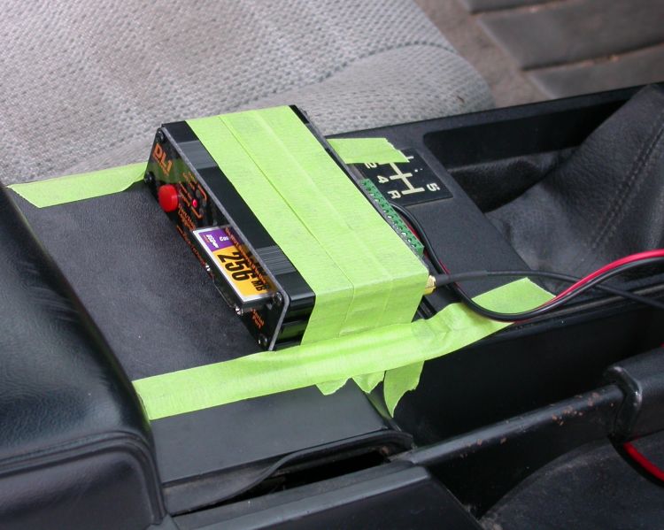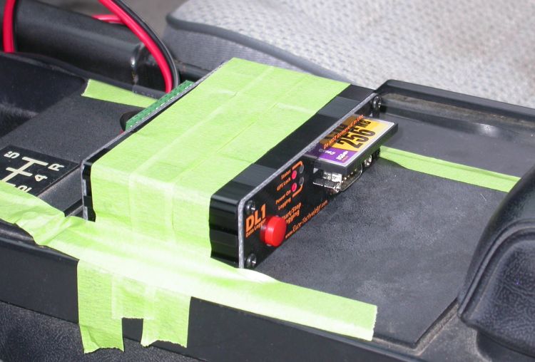 Unfortunately it has been raining since I hooked the thing up so I can't really get any high-g data, but it is just awesome. To install the system, I took the GPS antenna out of the bag and unwound the cable. I took some masking tape (scotch, green) to secure the antenna (black tape is a no-no as the carbon interferes with the signal) and as I got it close to the hood it leapt out of my hand and stuck to the roof. Magnetic! Sweet. A small piece of tape to stabilize the cable and it went in thru the corner of the window/weatherstrip. I plugged the antenna into the box, taped the box to the console and plugged in the cigarette lighter. It has four LED's for 'Status', 'GPS Lock', 'Power On', and 'Logging'. The first GPS lock takes a few minutes and (they say) the next ones get much shorter. Mine took about 2 minutes. Then insert a formatted (to FAT or FAT16) compact flash card and push the big red button. The 'Logging' LED pops on and you are recording data! Each time a 'sample' is taken it just adds another file on the card. A 64MB card will yield 2.4hrs of data, and a 2gig card will get you 3 days! I opted for the 256MB card and I will report its capacity as I play with it more. The block connectors at the back of the DL1 allow hookup of more sensors and inputs.