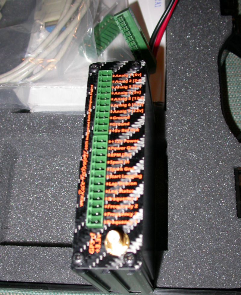 The unit is TINY and incredibly light. I plan on using it in the B4C (1992 1LE/B4C Camaro) for autocross and open lapping/instructing and then (of course) in the road race car (SCCA ITA, NASA PS2). My best friend Frank co-drives the ITA car and we run very similar times. It will be very nice to know who is quicker where (so we can both get faster) and how much sector time we lose/gain with chassis/engine tuning. I researched a TON on DA units and settled on the DL1 due to its incredible amount of data with very simple hookups (easy to swap from several autocross cars at the same event and get data from a bunch of different cars and different drivers) and its expandability. I have read everything I can find on the DA subject (I have owned and re-read Buddy Fey's book 'Data Power' since it came out in 1993) and spoken to many teams and DAGs (Data Acquisition Geeks....the guy on the team responsible for the DA system) about what I really need in a system (and what I don't need) and how much expandability is needed and how much is just nice. The sides of the DL1 are aluminum and it comes with small aluminum clamps that slide into the sides. The front and back are CF or CF-look. Pimpy.