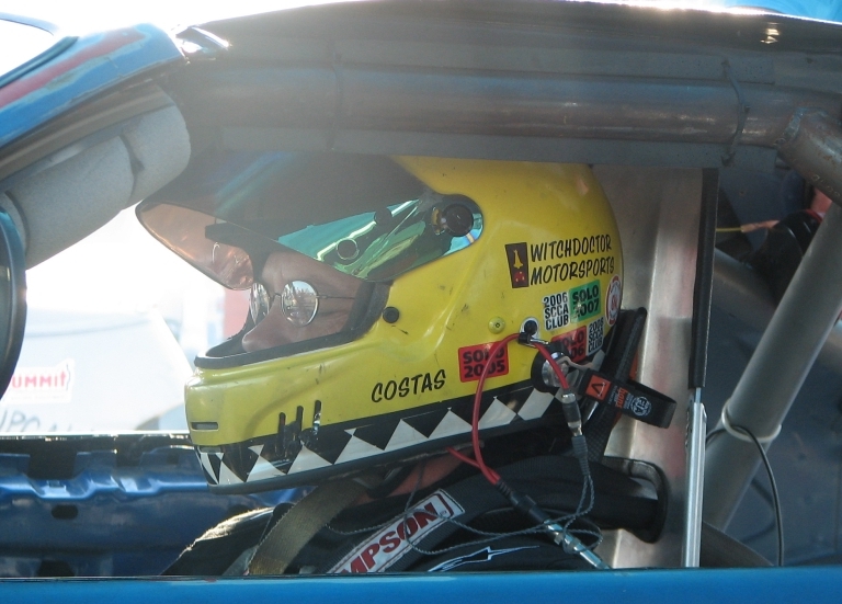 Anna bringing the car home (wore Costas' helmet for the radio hookups)!! WE FINISHED!!!