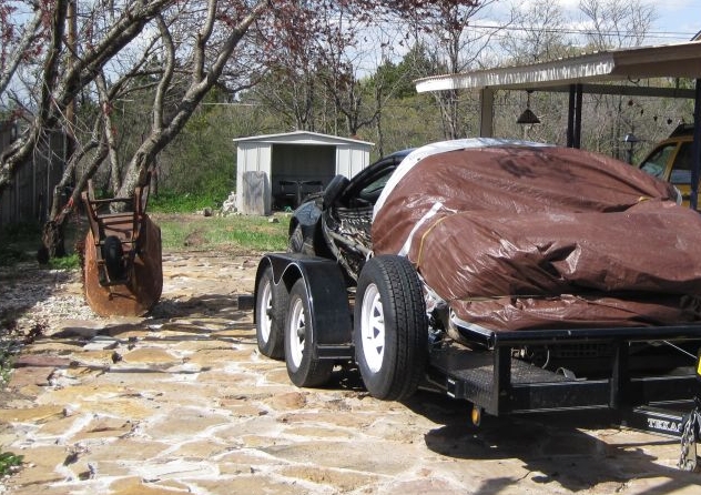 Truck is hooked up. Ramps are blocked off. Easy does it now. Reverse gear, gasgasgas. It's working! The trailer is moving, the ramps are sucking in, and the car is slowly sliding forward. Little by little, the car creeps forward on the trailer. We get it to a point where the car has stopped sliding, and is getting ever close to coming off the ramps. So we call it quits on that idea. We hook the come-along back up and try try try to get it moved. Inch by inch it seems to be working. After A LOT of cranking, the car is finally ON the trailer. Barely hanging on. To say the trailer was tail-heavy was an understatement (there's that foreshadowing again). Damn, son! Strap it down, we'll cover it up and get the F outta here!