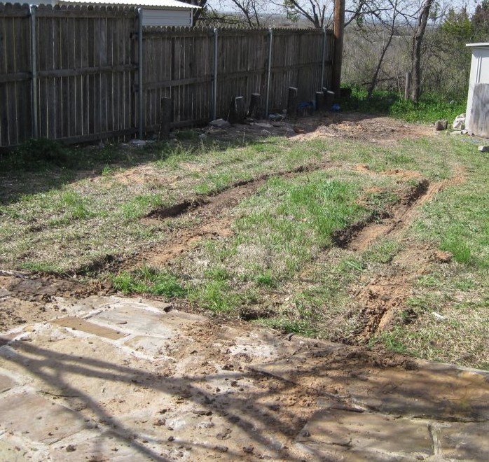 Easier said than done. The soft dirt at the lip of the patio was no match for the truck tires, as in, the tires sent the dirt flying. The ledge/form of the patio was now a good few inches above the dirt. I back the truck up and we throw some wood into the newly excavated ruts. The truck climbs up onto the patio… only to get hung up on the unleved rocks. It’s not even a 2” height difference between the edge of the patio concrete and the top of the rock, but the dirt embedded in the all terrains just lets the tires spin. The back yard is not even by any means either. The front tire of the trailer is at the base of a small hill making things just that much tougher. Un-freakin-beleivable. A little gas, a lot of gas, add wood, nothing works. If I back up, I fall back into the ruts. Finally we decide to back up, move out of the ruts and take another stab at it hoping I don’t make a repeat performance. GAS GAS GAS! Yes, finally , truck, trailer, car and on solid, uneven, ground. It’s (almost) over. ~4:30pm.