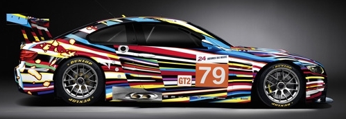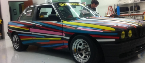 So the 'theme' this year was based on last year's BMW LeMans entry which was the latest generation of BMW Art Car (see above). Since our car had a scrapyard motor, scrap metal flares, motor and transmission mounts from scrap, and covered in scrap vinyl, it was dubbed the Scrap-E30 and we simply called it Scrappy. It kinda fits. When a sign shop cuts vinyl and ends up with narrow pieces that can't be run through a plotter, they scrap it. We used narrow pieces to imitate the original Art Car (which also was a BMW 3 series with a V8 in it too!!) and did our best to make it look 'cool'. The next photo shows us laying some colored strips onto the hood to get an idea of what it was going to look like.