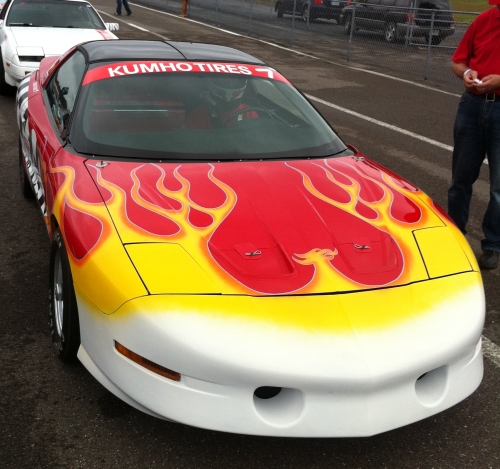 The 2012 Laguna Seca Mustang on soft Pirellis laid down a 46 second run that pretty much nobody was beating in the first two hours. The Pros hot lapped it for a while at first and then it just sat getting its picture taken (a lot....gorgeous car!). Some cars came close and then finally someone cracked off a very high 45 to be the 'time to beat'. Fair and I gave a quick sideways glance at each other and then looked to the sky. The sun was just coming out from the skirt of a cloud and it looked like we'd have a half hour or so of sunlight before the next clouds took over. Some had dark-ish bottoms, so it was time to act and lay down two runs. We turned and walked back to the rig, silent.