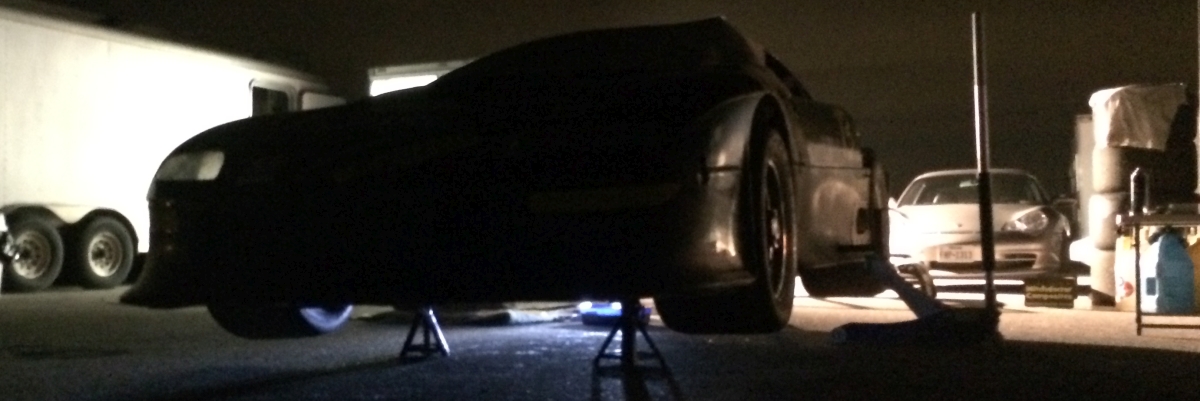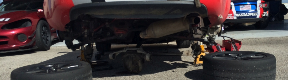 At a very early hour on Friday, our rig is southbound with MFW behind me and we're headed to the track. When we arrive the paddock is mostly full (dang it!) and we park further out than we'd like, but we snag enough land to add in Fair in the VoMo rig and MFW's wife's (Misty) rig as well. Anna had to work in the morning and would be headed down in Aero (the pcar) just after lunch. MFW and I unload cars and get to prepping. My going is slow as I'm also getting real work done (conference call in one ear, ratchet in one hand) but it all goes pretty smooth. MFW and I tech both my car and his and do our paperwork and eventually go to tech and get our annual stickers. With Scratcher up on stands I look over the whole car and it all seems fine. Neil (ThinkFast Engineering) and I have planned a front suspension geometry upgrade, but I didn't have time to get all the prep work and parts ready, so the setup stays the same, but the freshened/tuned AST's go on the car as well as the sticker Hoosiers. Anna showed up in the afternoon and pitched in as well, and then Misty in her rig and Fair in the VoMo rig showed and we had our paddock spot pretty full. I got my front ASTs from Fair and put them on and was hopeful for the next day.