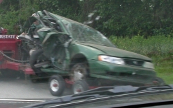 Ok, first update. Stopped at Home Depot to buy some wood to fab up some ramps to unload this thing. NO WAY it is coming off without some serious help. Walking back up to the truck there is a complete redneck (early 70s Ford truck, all primer, exhaust leak, with mullet, with small boy child who possessed similar mullet, ‘slot’ mags and raised white letter bald tires). He was sitting in his truck looking at the car and said (I swear I am NOT making this up) ‘I bet this thing goes NINES!’