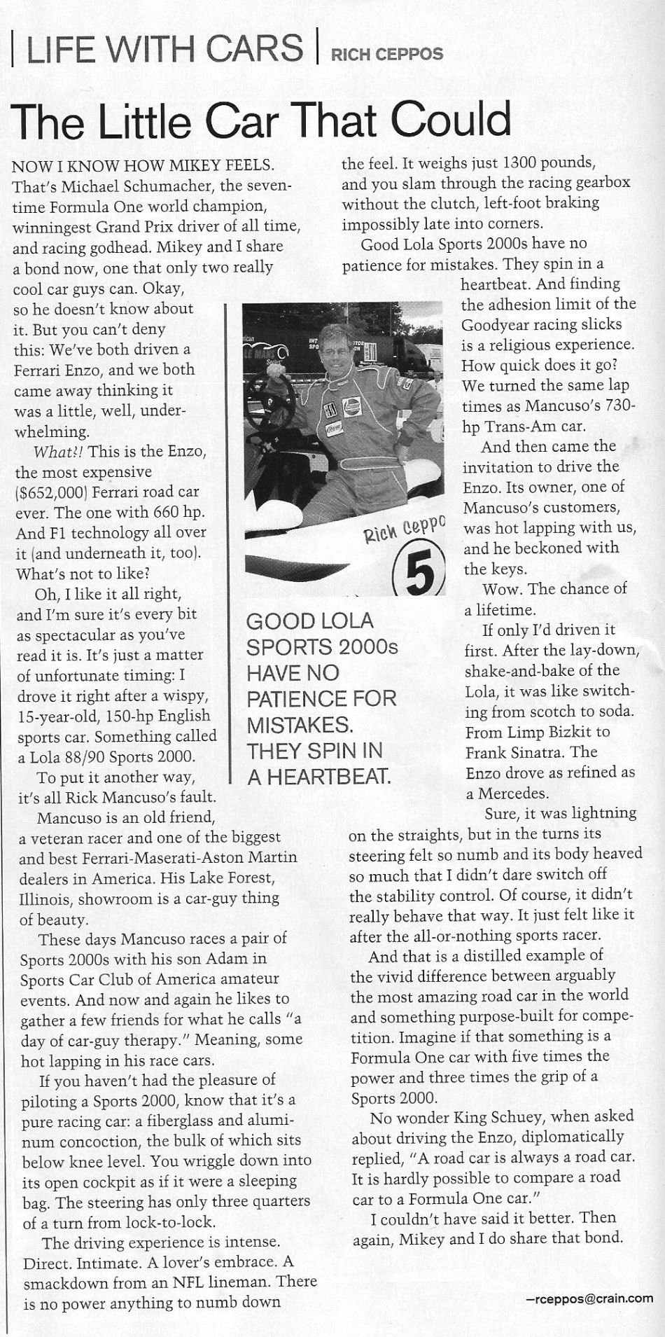 Imagine my surprise when an Auto Week hits the mailbox with an article about the little Lola. Please read-on.