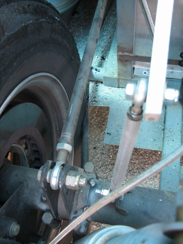 With only 10 minutes left of our time, I hop in to do three more fast-ish (no corner workers, no EVs) laps. The lugs are checked, air pressure tweaked and with a thumbs up after the latch check I launch. Lunch is nearly over and the Lotii guys are hanging about and peeking at Scratcher and the Synergy rides. I pass by the front straight twice, both times at full song. The car is on the jumbos and the balance is good and the grip is phenominal. I can take the two bends on the front straight flat out (and I'm well over 150mph by the time I reach the first one!) and then drop the nose for t1. The last time by I take some time and cool the car a bit (the water never got over 180 on the track for the whole weekend) going to the far side and going into the tree turn I am determined to wait a bit later and carry some good exit speed. Previously I'd apexed a few feet too early and I wanted this corner right. So I setup just right and quick match-revs downshift to first and really stick my foot into it. The big 14.5" wide goodyears are good and hot and stick well. Then all hell breaks loose. An evilbad piercing noise is suddenly everywhere and the whole hatch area of the car is completely full of smoke and the cabin is right behind it. A quick gauge check reveals good oil pressure and temp ok, a shake of the steering says it is fine too. The car is a bit sluggish, but not bad. I don't feel like a tire is gone down. I gingerly take the car back to the pits as the smoke dissipates and head to the paddock. We pull the tail and find the lower link on the driversside has decided it does not want to play straight anymore and it looks like a boomerang. And it went right against the tire. Great.