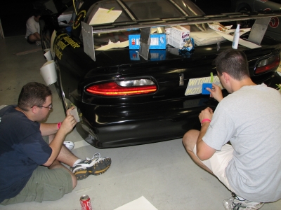 After tech we got the car down to the garage under our suite (which wasn't really ours, but was empty and we needed light) and the stickerfest began. I was fading bad and went upstairs and grabbed a shower and came down later to check on them. It was really starting to look awfully good.